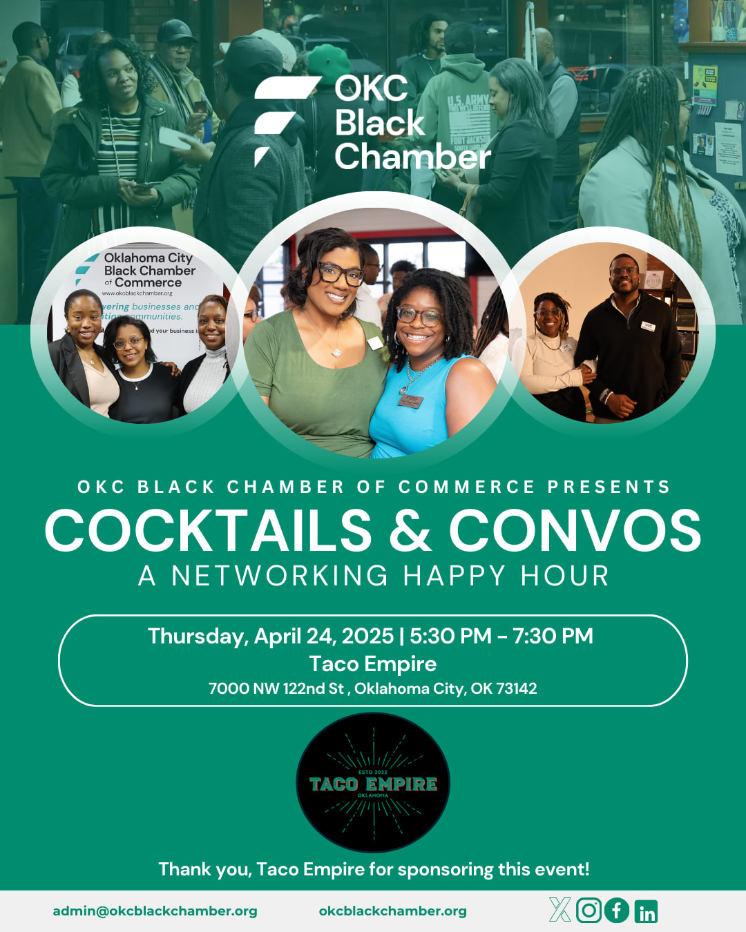Join the Oklahoma City Black Chamber of Commerce for Cocktails & Convos, a dynamic networking event held every fourth Thursday of the month from 5:30 p.m. to 7:30 p.m. This month, we're meeting at Taco Empire, a lively spot known for its delicious food, vibrant atmosphere, and great energy—the perfect setting to connect and build relationships! 📍 Location: Taco Empire | 7000 NW 122nd St, Oklahoma City, OK 73142 This is your chance to network, collaborate, and cultivate meaningful connections with fellow entrepreneurs, professionals, and community leaders. ✅ Expand your network and share your vision 🏆 SMALL BUSINESS SPOTLIGHT – $50 (2 Available) Bring your business cards, an open mind, and a spirit of collaboration! Whether you’re looking to grow your business, find new opportunities, or simply enjoy great conversations, this event is where connections happen. 🚀 Don’t miss out—come make your mark and elevate your connections! FREE Admission For Members | $10 for Non-Members – RSVP Today! Casual restaurant serving Mexican dishes such as tacos made with blue corn tortillas.